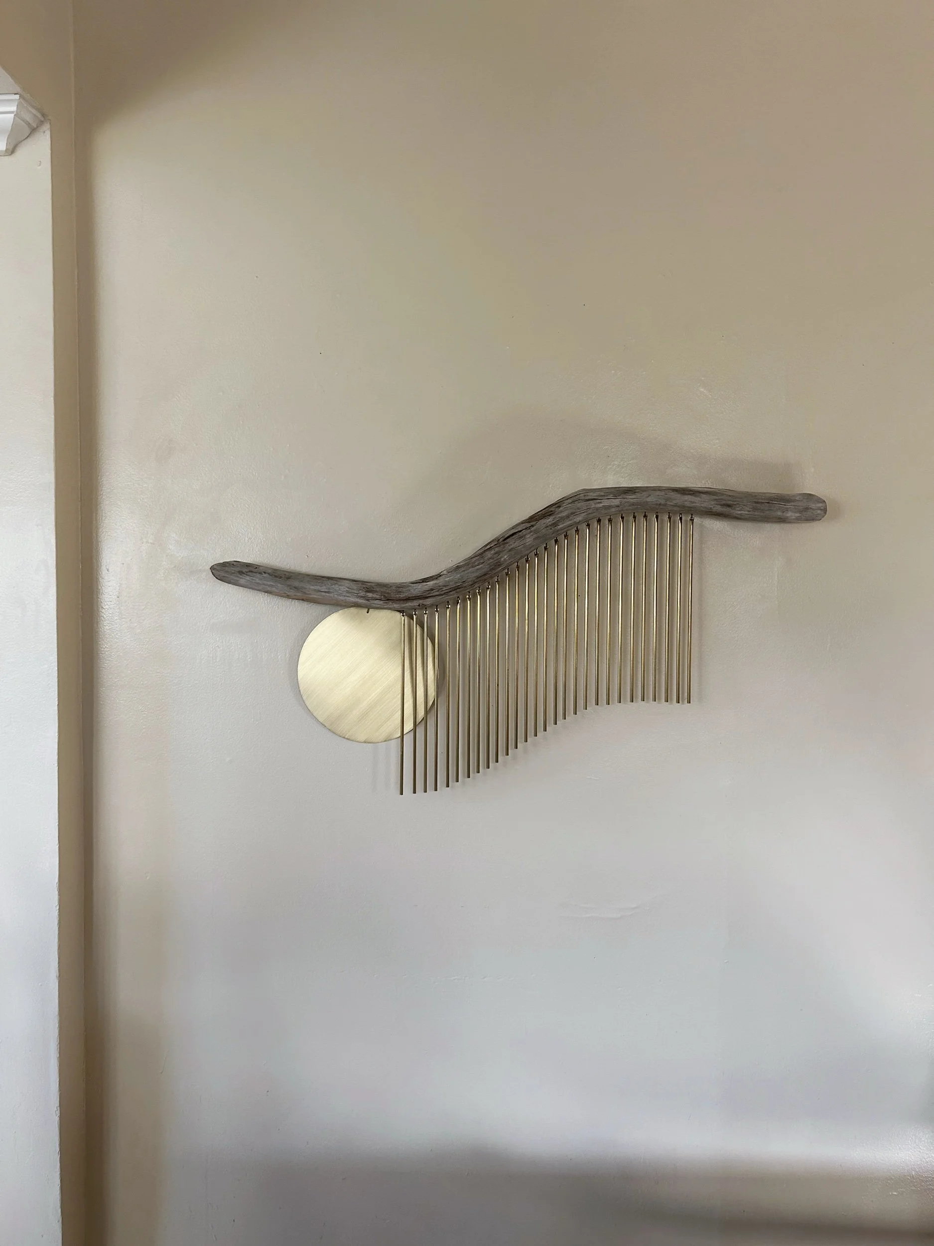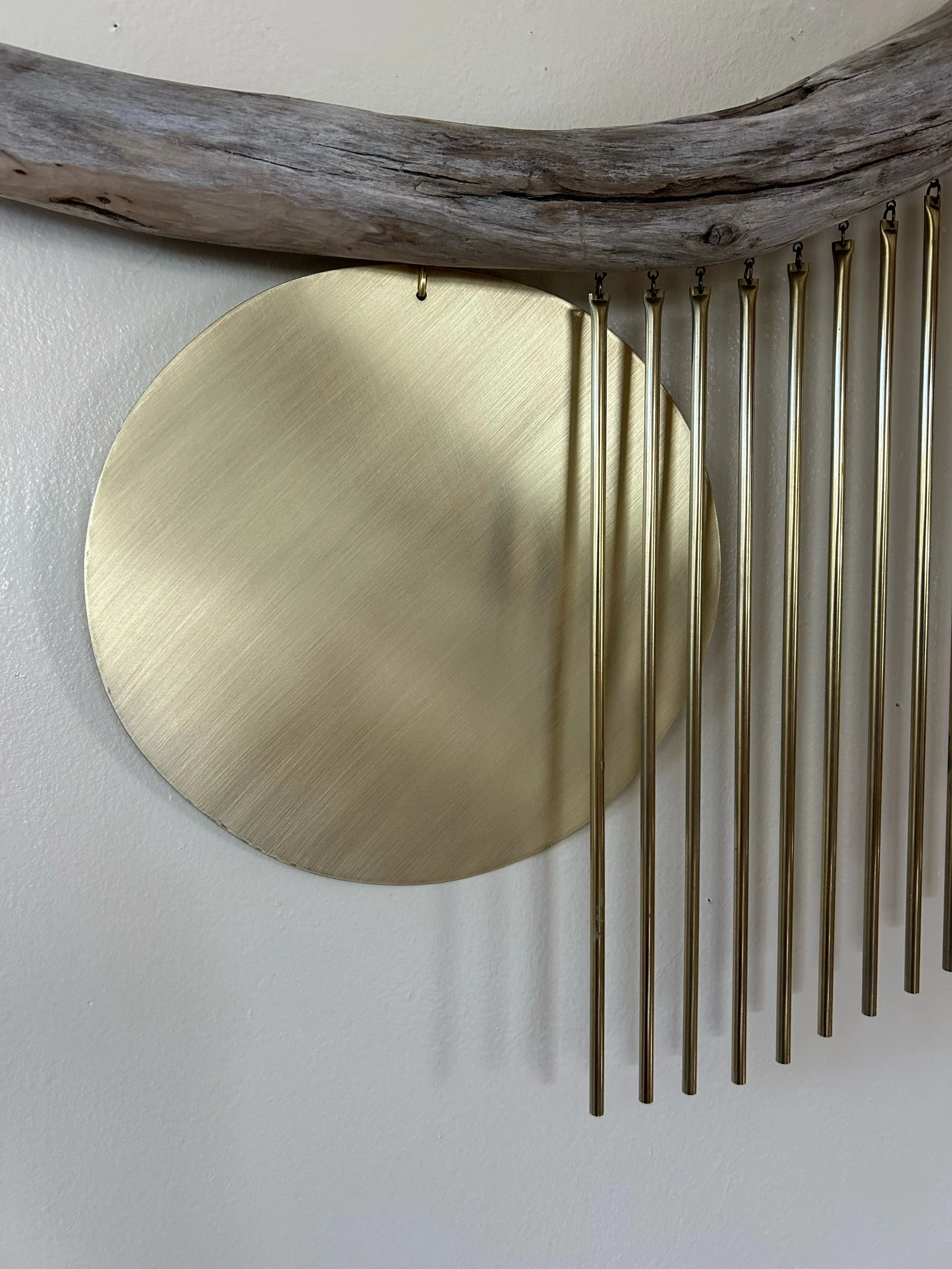 Driftwood wall sculpture made of brass tubing and a brass sheet circle.