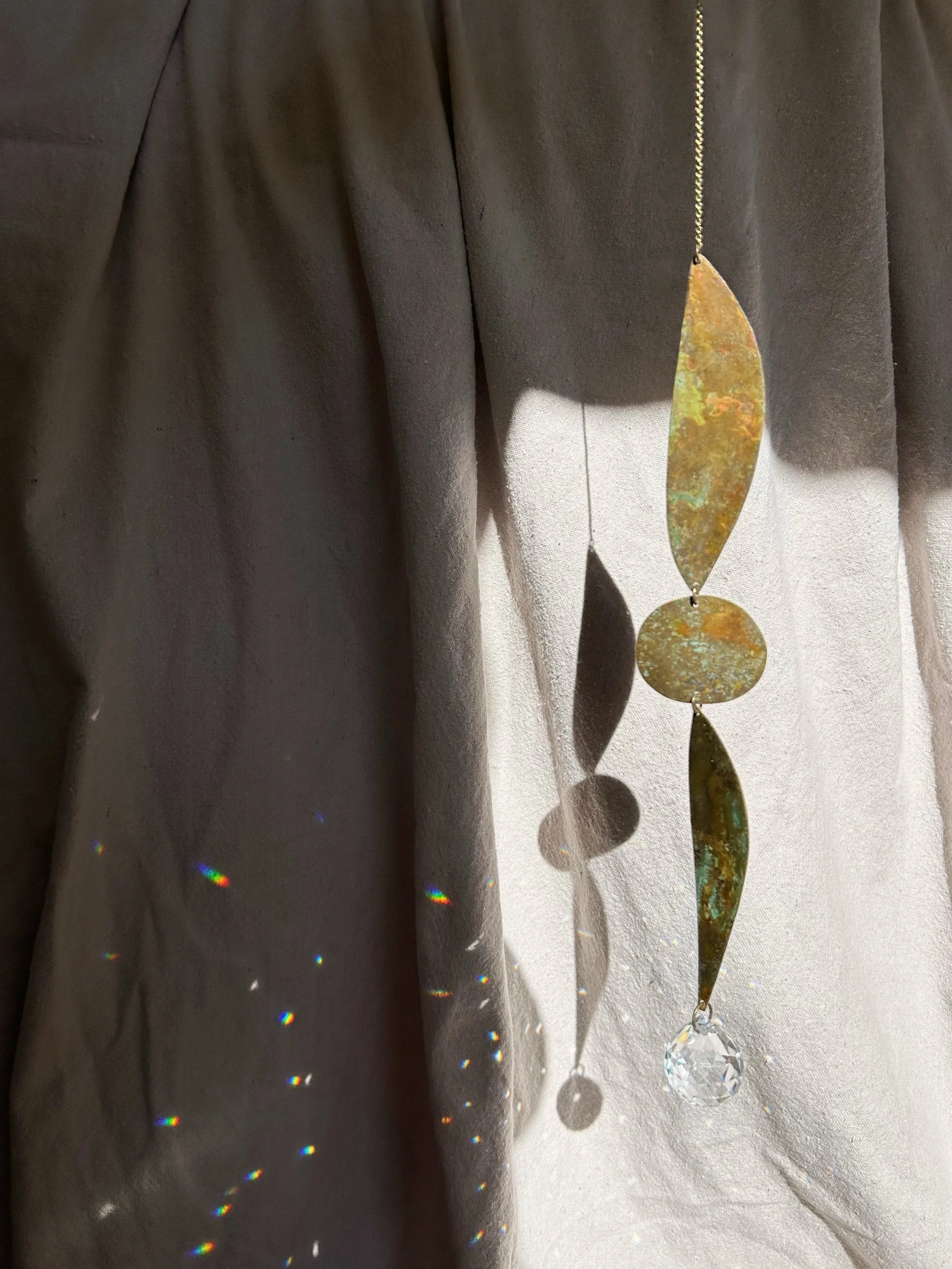 one-of-a-kind, ready-to-ship light catcher made of patinated brass shapes.