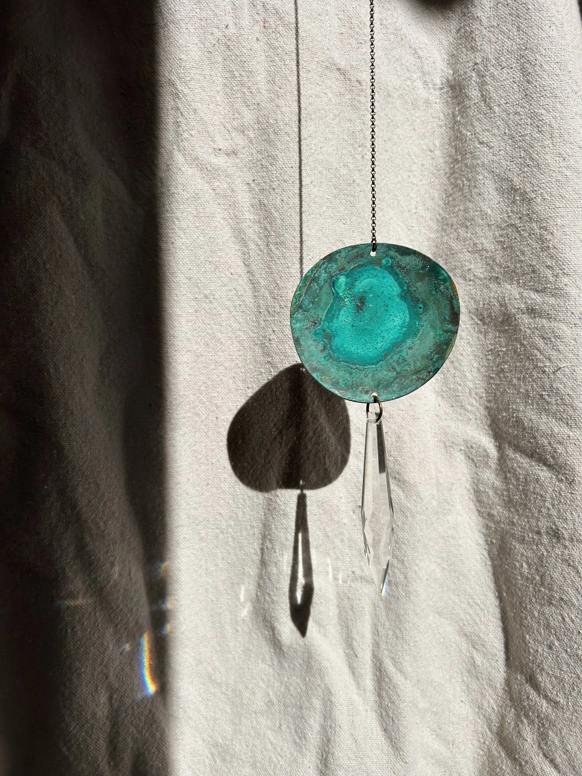 one-of-a-kind, ready-to-ship light catcher made of patinated brass shapes.