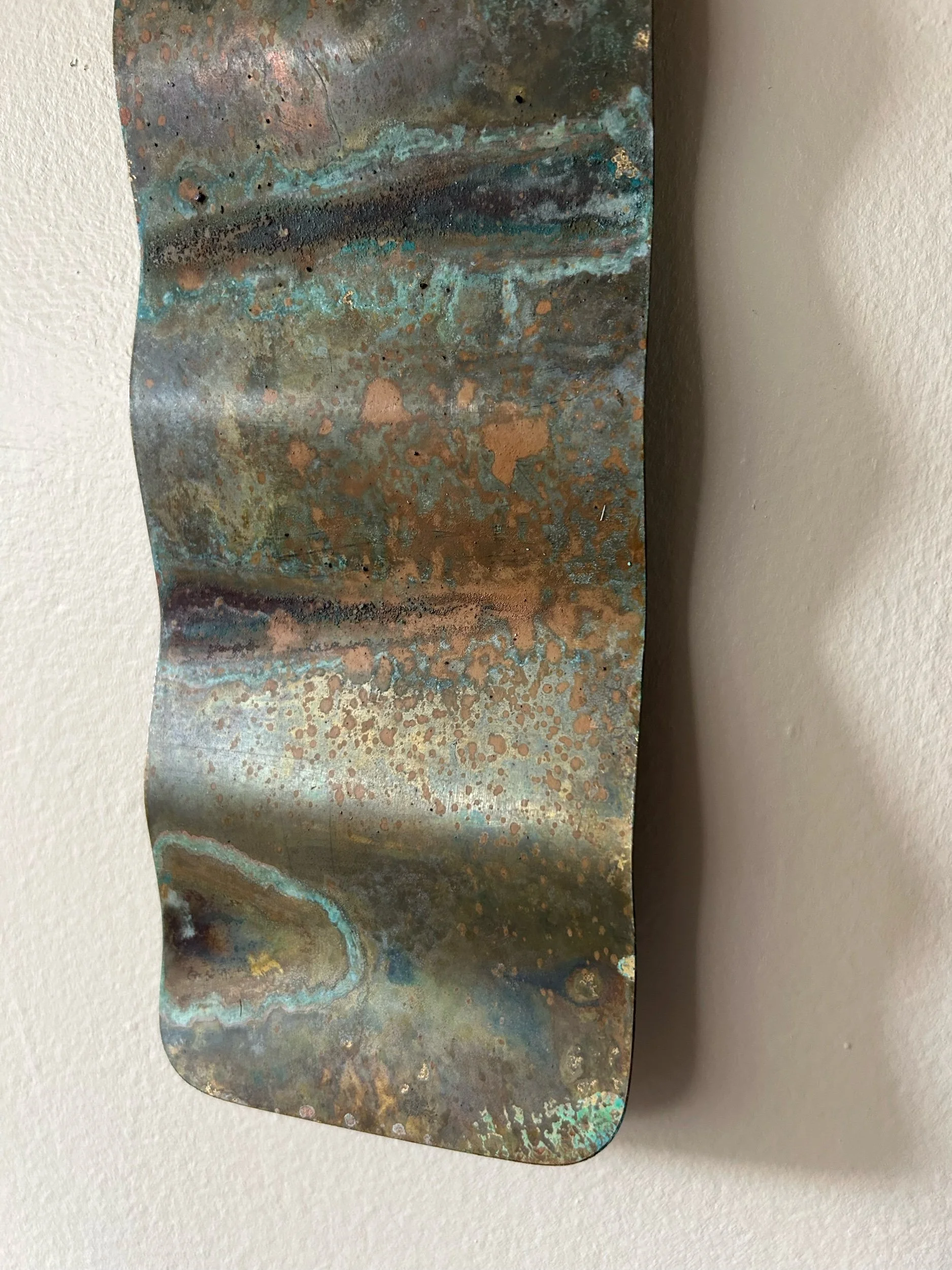 Wall hanging made of patinated brass pieces, hammered brass rod connection points, and a wooden shape. There is a hole drilled into the backside for easy hanging, flush against the wall.