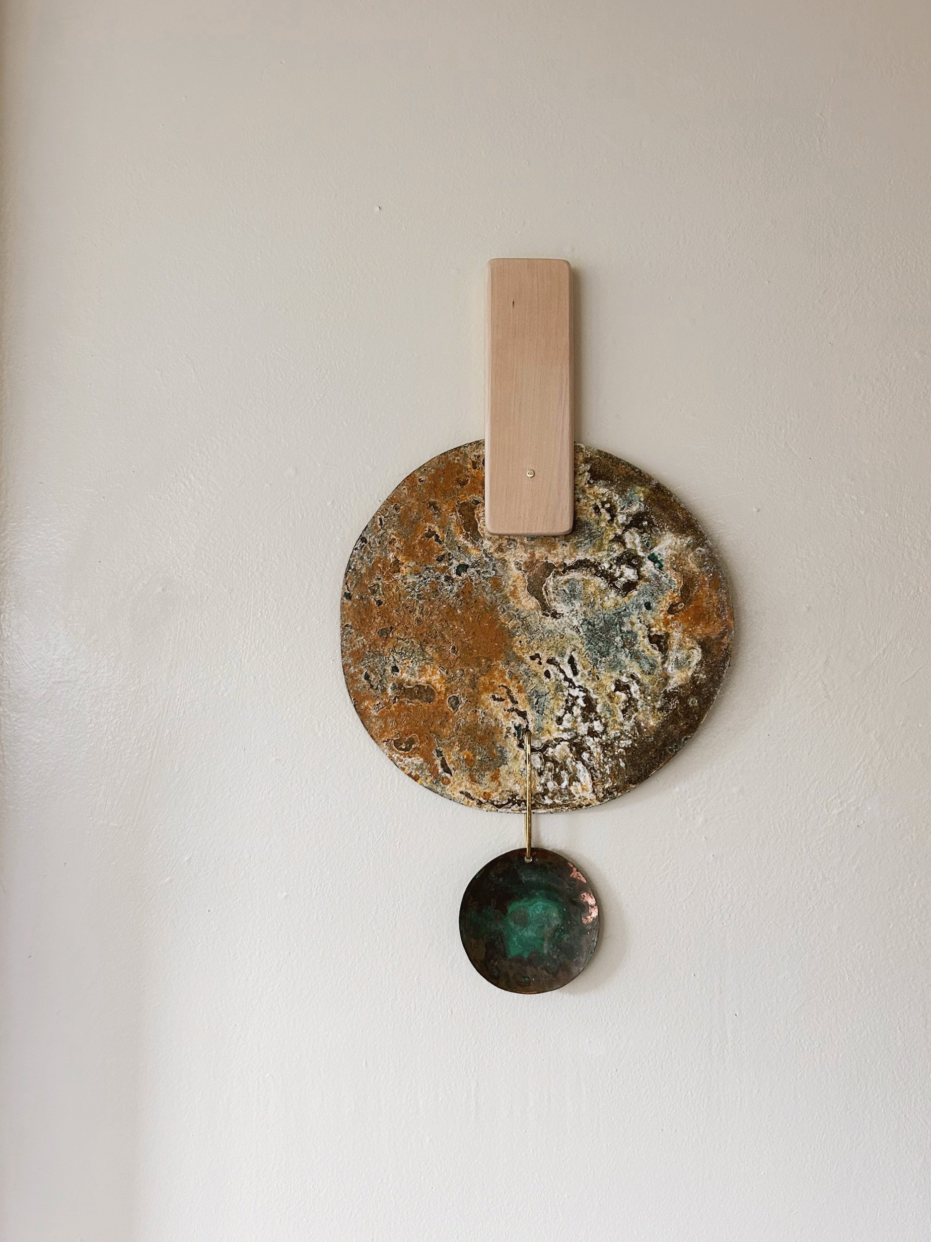 Wall hanging made of copper-patinated steal and copper shapes, hammered brass rod connection points, and a wooden shape. There is a hole drilled into the backside for easy hanging, flush against the wall.